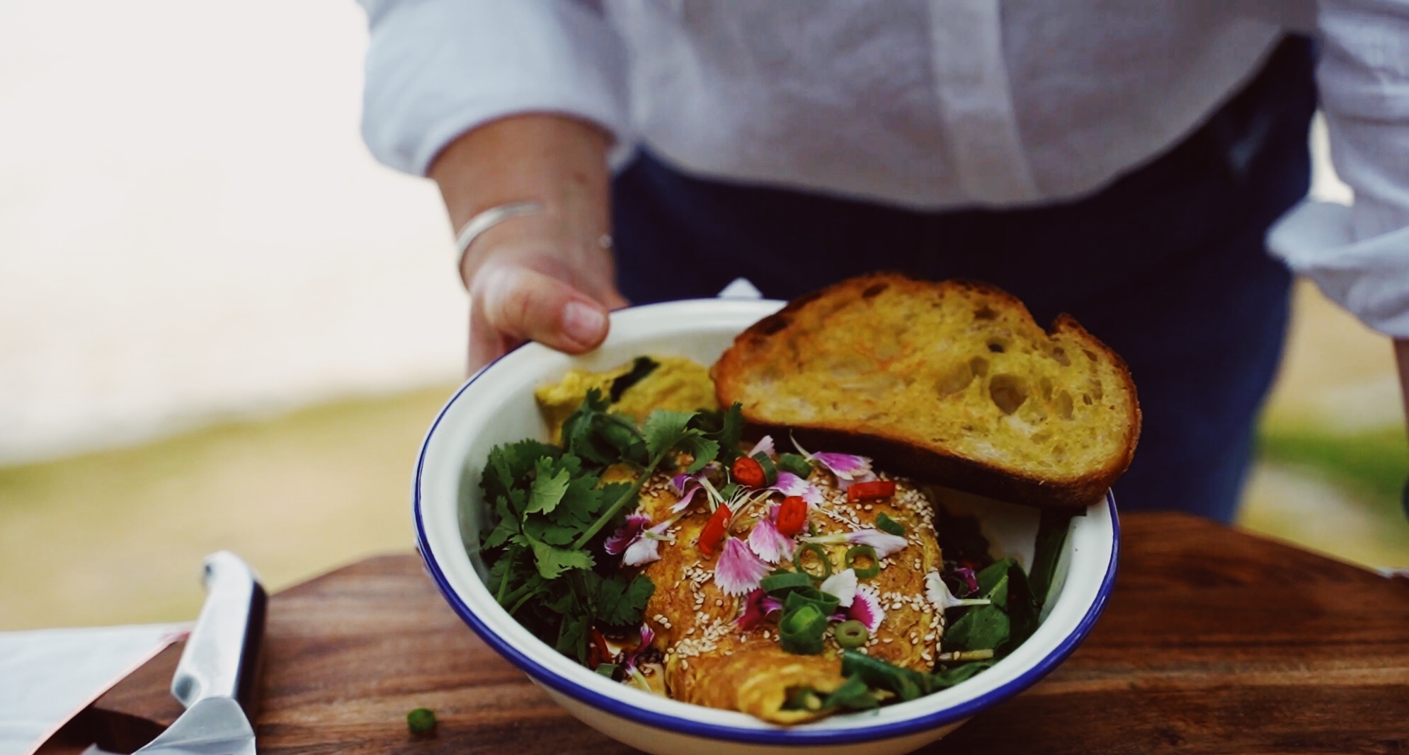 As with all our recipes the fundament key to flavour is sourcing and eating fresh, local produce. For this recipe, we harvested the eggs from my friends farm in Myocum, the morning of shooting this little video, so yeah ….. the eggs were super duper fresh and local! The ginger was local and the greens from our mates garden, and of course the coriander is from local legends The Gourmet Salad Hut, if you’re ever travelling through Byron (or like us are lucky enjoy to live here), you simply must go seek out The Gourmet Salad Hut crew at one of the local farmers markets’ and stock up! We love love love their coriander (and all their luscious leafy greens for that matter!). And if you can’t use all the herbs, simply turn them into a beautiful homemade pesto.